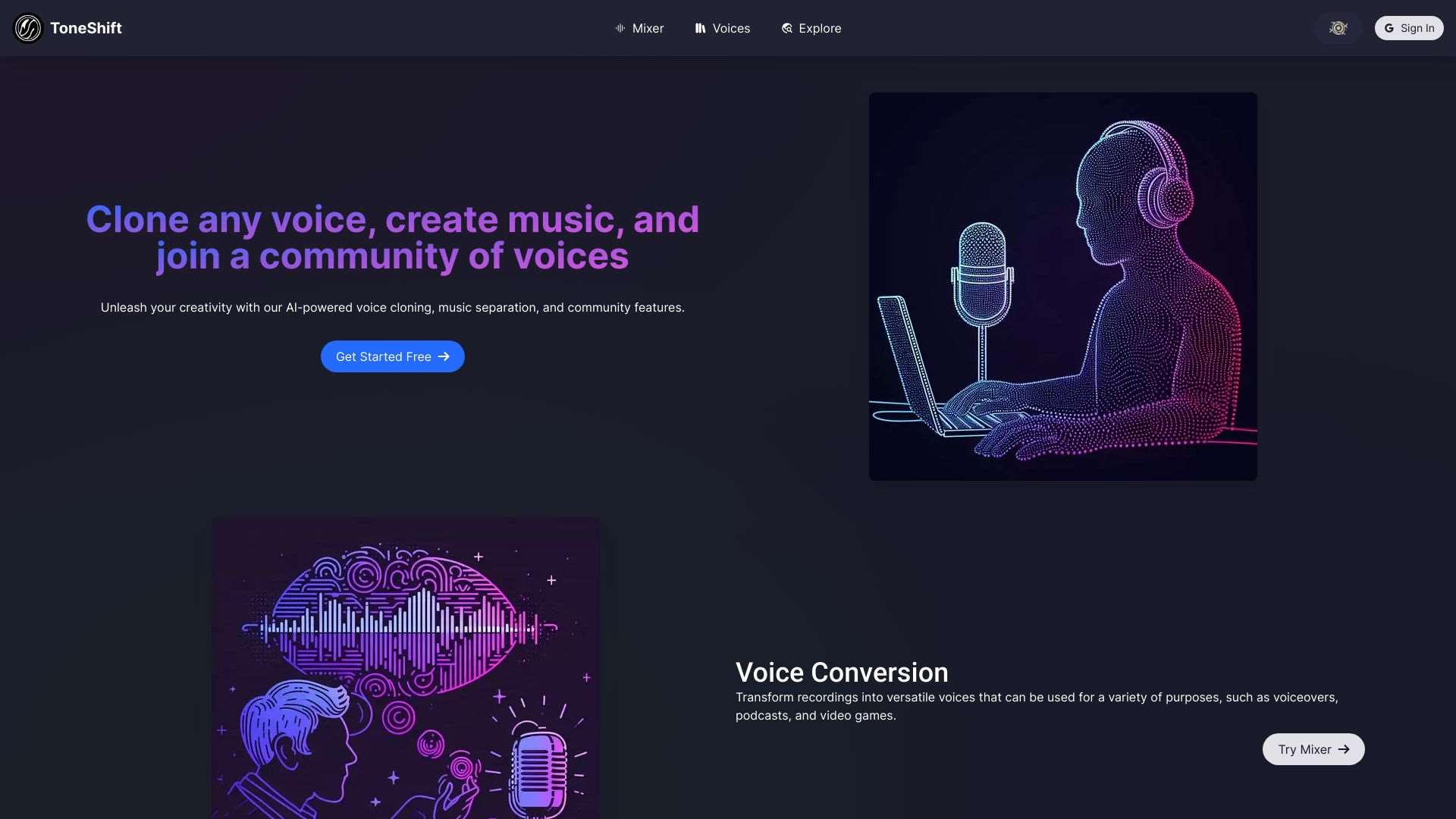 ToneShift uses AI to clone voices and separate music, offering powerful audio manipulation capabilities.